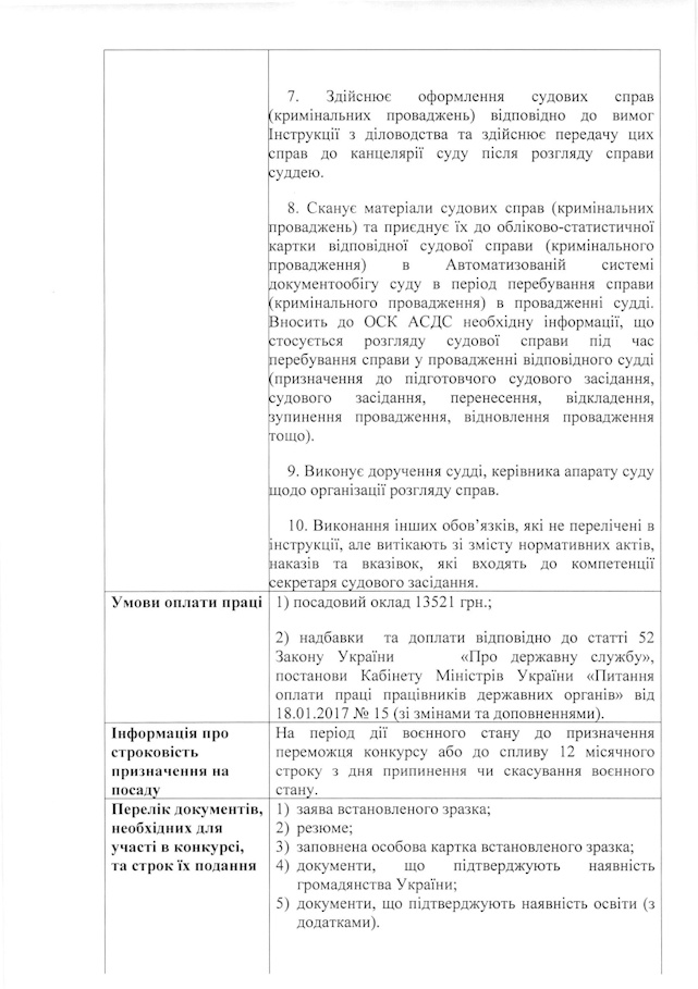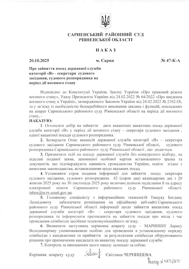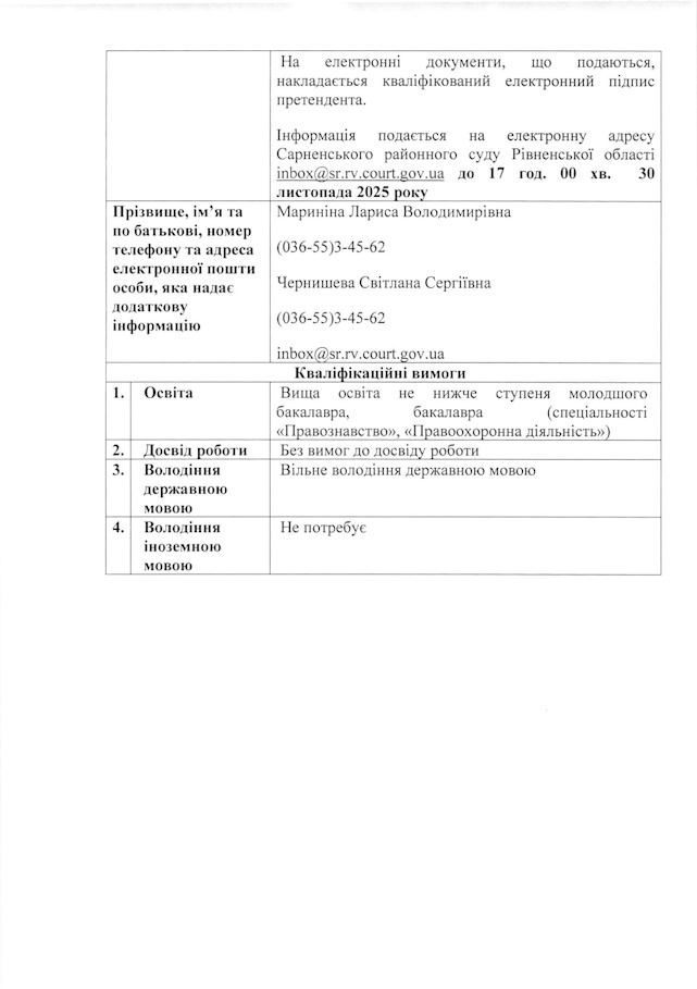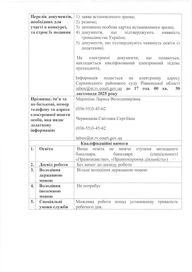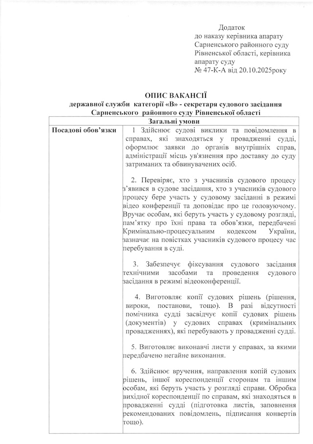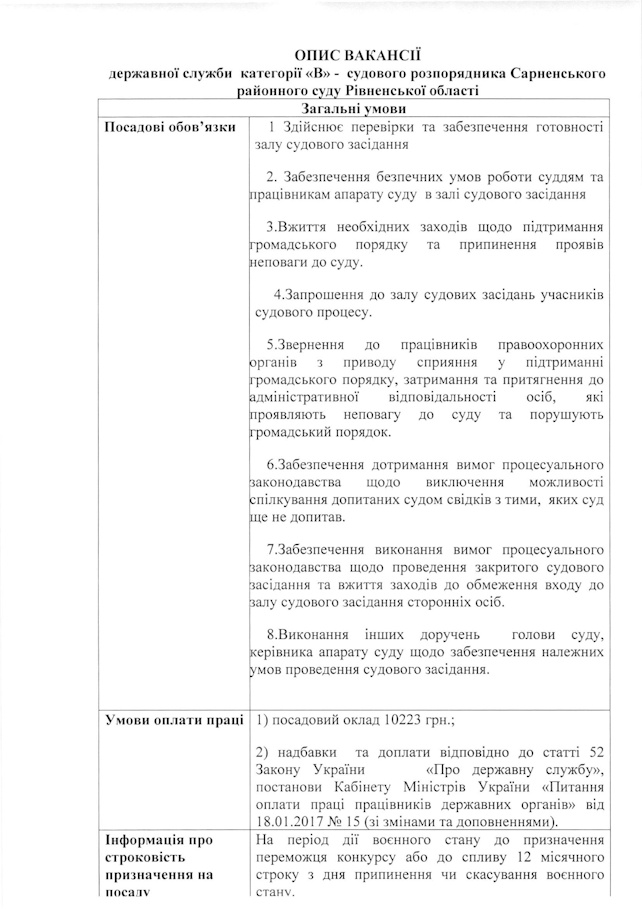 Сарненський районний суд Рівненської області оголошує добір на зайняття вакантної посади державної служби категорії «В» секретаря судового засідання